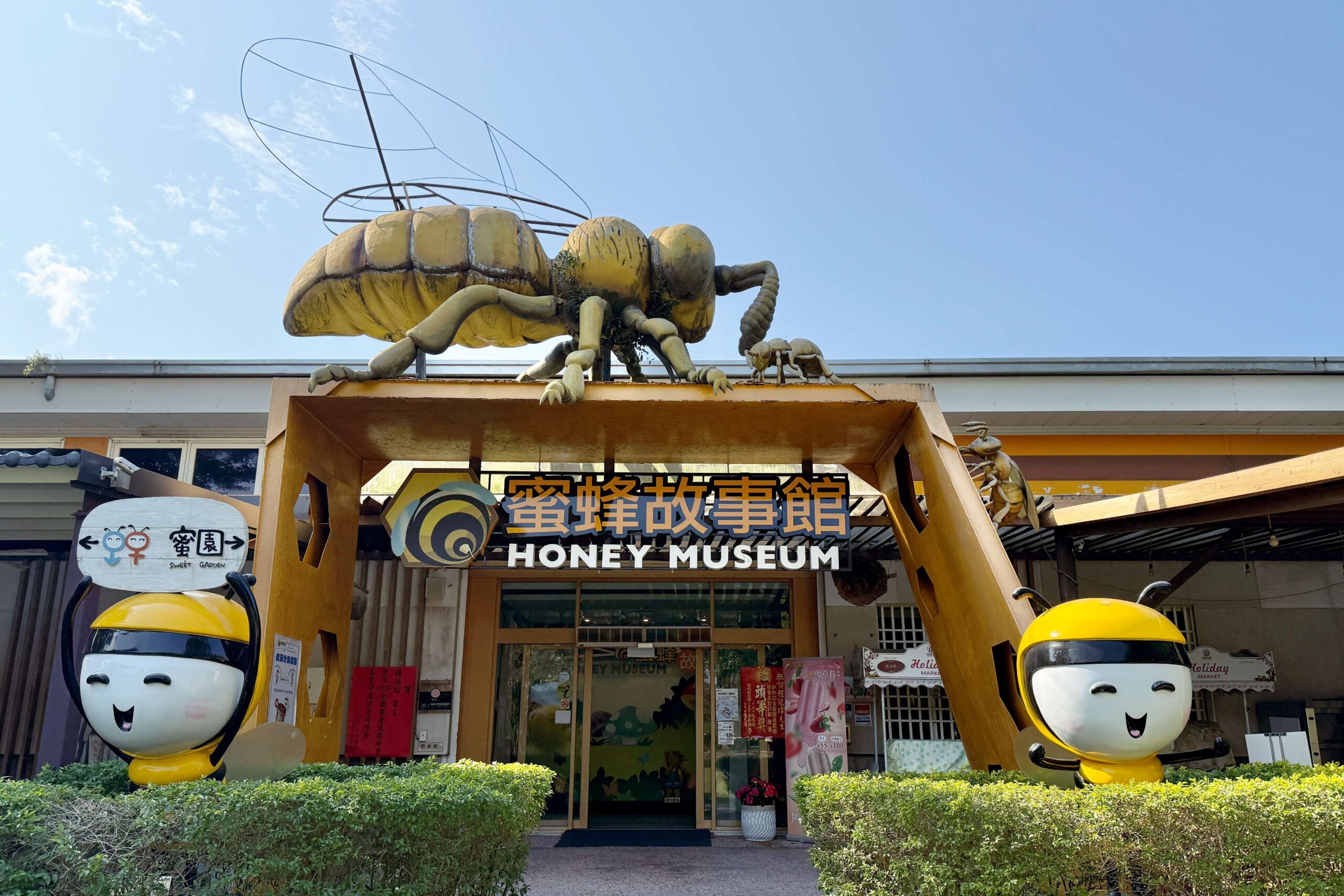 蜜蜂故事館位於古坑綠色隧道的起點,門口設有免費停車場,還沒走進園區,就先被可愛的蜜蜂公仔給融化。