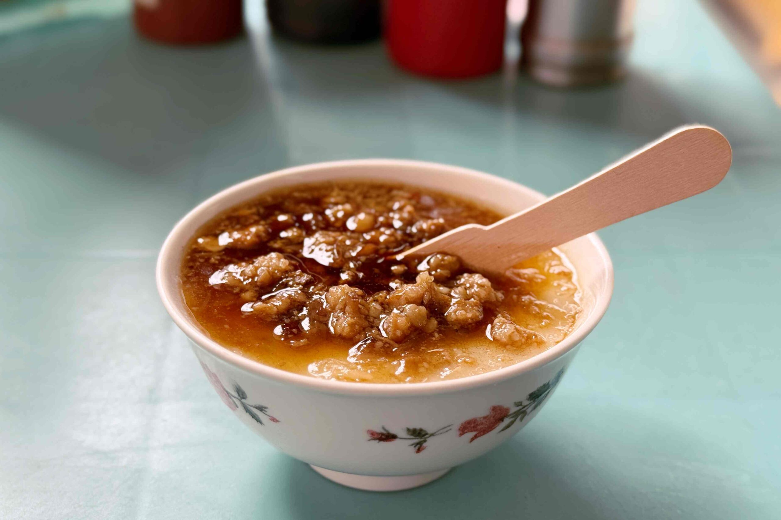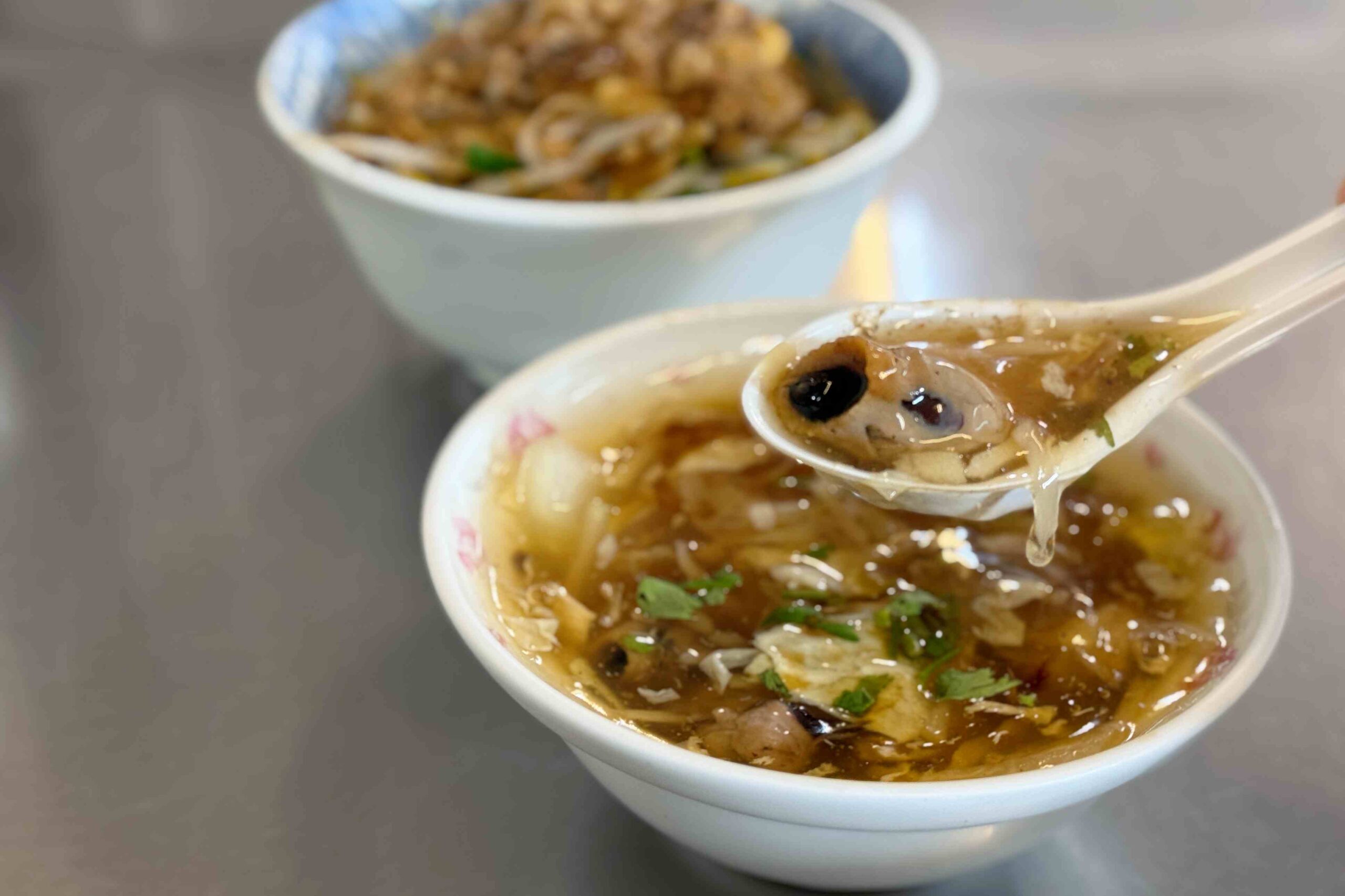 Just a five-minute walk from Taiping Old Street, Squid Xing is easy to spot with its bright green sign proudly declaring “Original Founder.” Right next door is the Douliu Xinxing Temple I mentioned earlier. Squid Xing started as a small stall in front of the temple, but thanks to its locally beloved squid mouth thick soup, it gradually made a name for itself in Douliu and eventually expanded into a large shop with its own parking lot. Inside, the walls are covered with medals and newspaper and magazine clippings, a testament to the restaurant’s popularity.